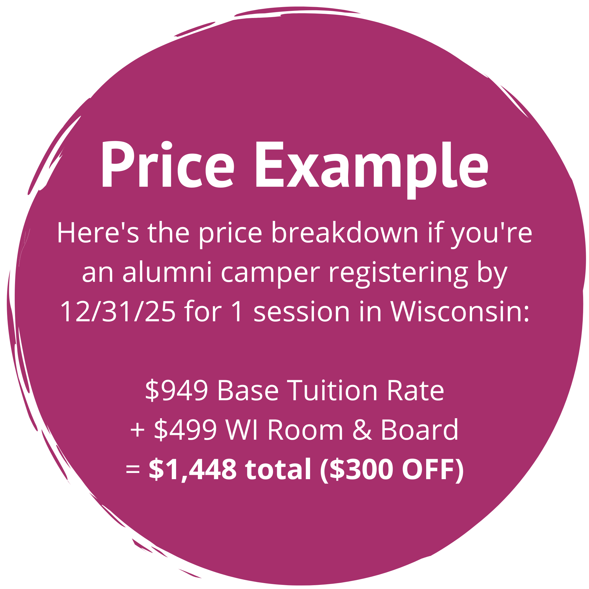 Alumni Friend Discount:ย $50 OFF Tuition, per-camper / per-session (Applies EACH new friend you refer who enrolls. You BOTH get a discount)